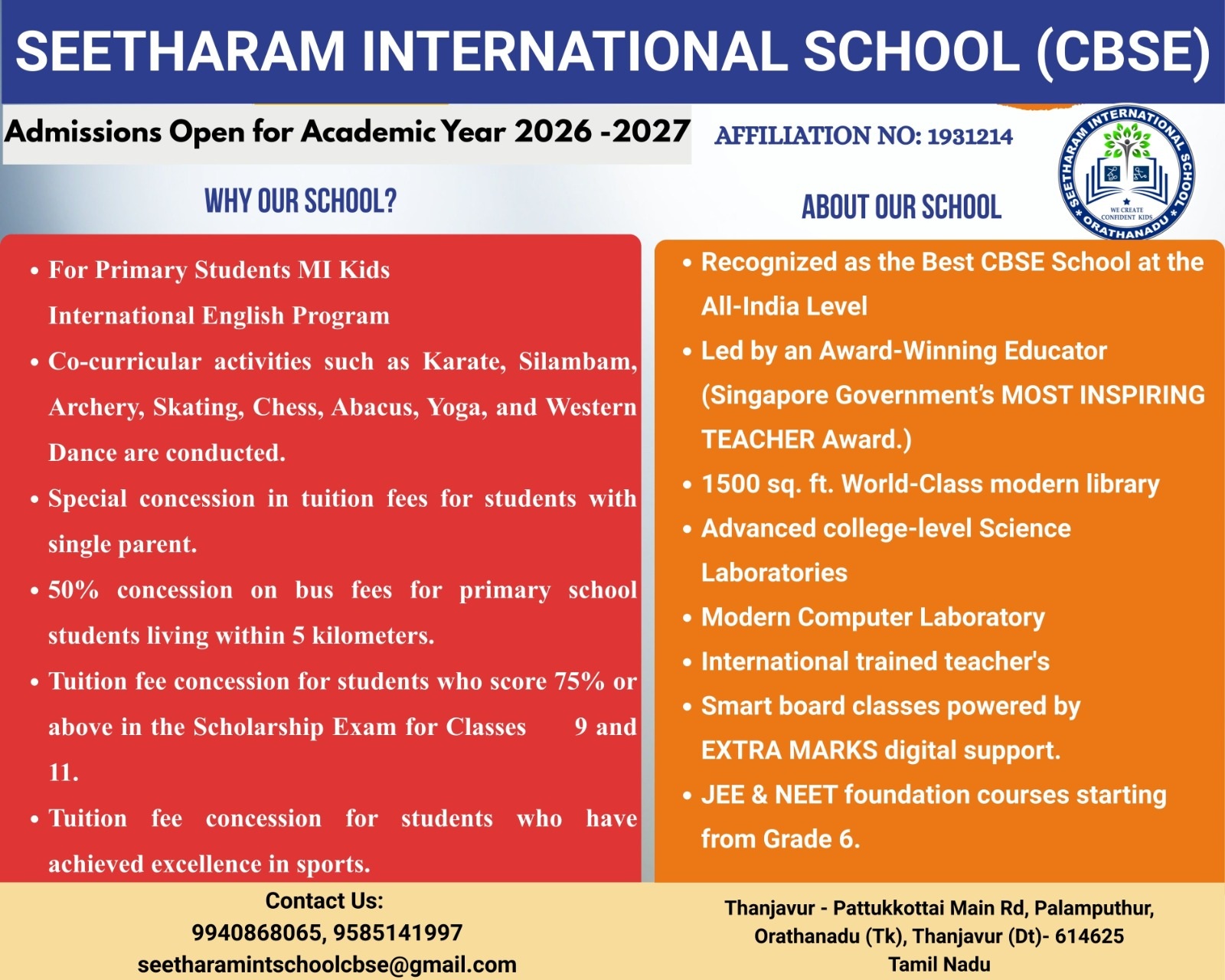 Seetharam International School was established in 2016 and it is a secondary school. It is an international school situated in the 24 km south of Thanjavur town.